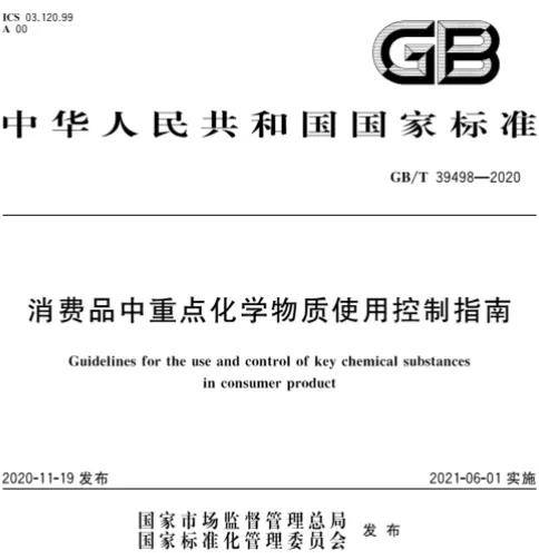 2020年11月19號(hào),國家標(biāo)準(zhǔn)化管理委員會(huì)發(fā)布了2020年第26號(hào)公告,正式頒布了GB/T 39498-2020 《消費(fèi)品中重點(diǎn)化學(xué)物質(zhì)使用控制指南》。因其管控化學(xué)物質(zhì)多,涉及產(chǎn)品范圍廣,被稱為“中國版REACH”。