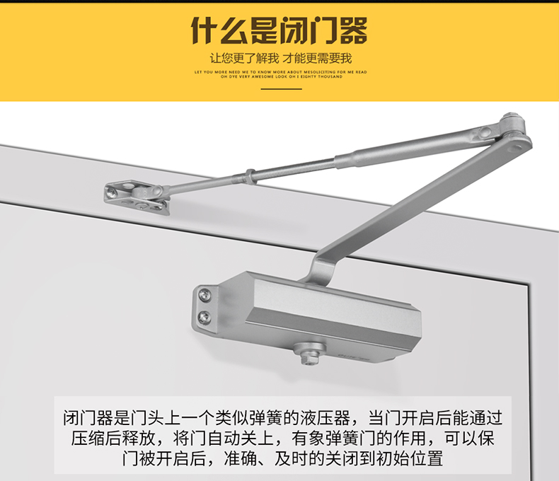 閉門器是門頭上一個類似彈簧的液壓器,當門開啟后能通過壓縮后釋放,將門自動關上,有像彈簧門的作用,可以保證門被開啟后,準確、及時的關閉到初始位置。
