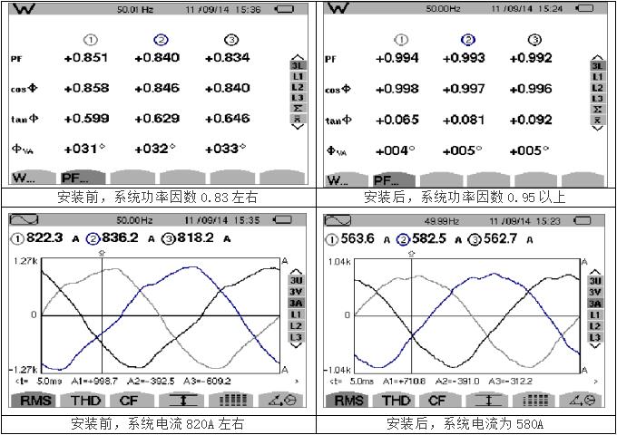 通過低壓TSFGD裝置運(yùn)行后,系統(tǒng)功率因數(shù)從0.83左右提升至0.95以上,系統(tǒng)運(yùn)行電流平均值從820A降低至580A,為用戶解決電能質(zhì)量問題,并節(jié)約10%以上的電費(fèi)。