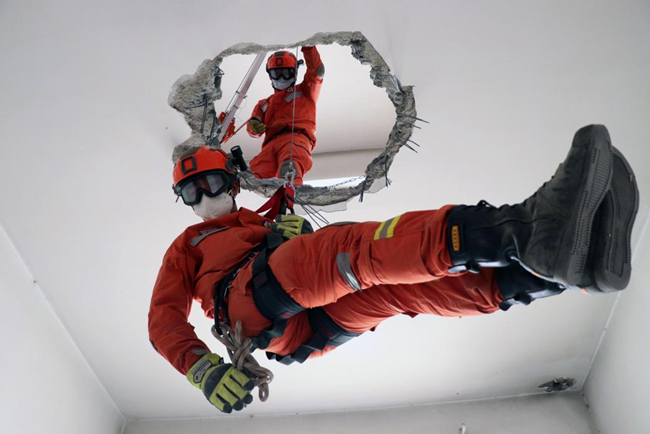“有人嗎?聽到請敲擊三下?!薄皥蟾妫瑥U墟東側(cè)有1名被困人員,生命體征完好,右小臂壓在石板下可能骨折?!本仍菥氈?,還設(shè)置了狹小空間救援、深井救援、繩索水平救助、傷病員急救等多項科目,充分檢驗了隊伍在突發(fā)疊加災(zāi)害下的救援力量投送及協(xié)同作戰(zhàn)能力。