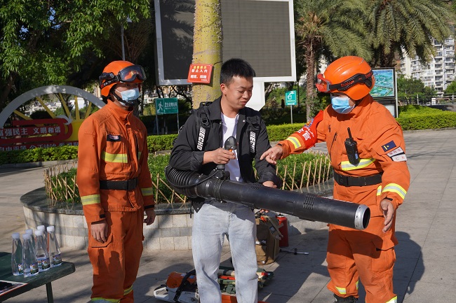 在另一側(cè)的裝備展示區(qū),風(fēng)力滅火機(jī)、水泵、工業(yè)消防無人機(jī)、夜視儀等森林滅火裝備依次排列,消防救援人員向大家詳細(xì)講解滅火裝備的性能參數(shù)與使用方法,“我試了這個(gè)裝備還是有點(diǎn)重,消防作業(yè)真的很艱苦,給他們點(diǎn)個(gè)贊!”從昆明來到攀枝花游玩的廖先生在體驗(yàn)森林消防滅火裝備后表示,他也會(huì)將現(xiàn)場(chǎng)學(xué)到的防滅火知識(shí)傳遞給家人和朋友。