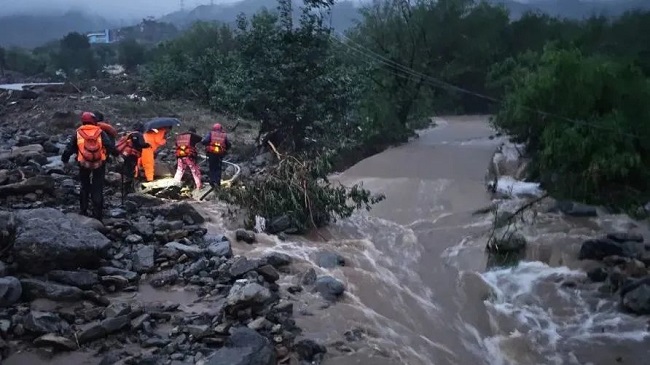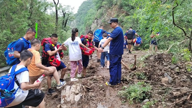 接到鐵路列車人員被困的警情后,北京市消防救援總隊立即建立前方指揮部,并建立穩(wěn)定消防通信鏈路,與當?shù)毓ぷ魅藛T對接,對被困人員情況全面摸排,掌握現(xiàn)場整體情況。z180、k396次列車被迫在門頭溝安家莊和落坡嶺站附近停車,車上乘客長時間滯留,出現(xiàn)食品和藥品短缺的情況。8月1日,市消防救援總隊特勤支隊的25名指戰(zhàn)員組成第一梯隊沿109國道趕往安家莊站,在下葦?shù)榇宕髽蛴鰖180車次一名旅客,據(jù)悉車上980人,急需食品和藥品。救援隊沿著永定河北岸向安家莊挺進,冒著沿途多處出現(xiàn)塌方和滾石,于8月1日19時抵達現(xiàn)場。而就在一個小時前,18時10分許,在落坡嶺站救援的部分指戰(zhàn)員已成功打通救援路線,增援來到安家莊站。此時,z180次列車所有乘客已經(jīng)全部疏散至安家莊村,區(qū)政府組織500人的保障隊伍,沿消防救援力量打通的救援路線前往安家莊運送物資。