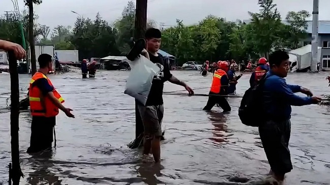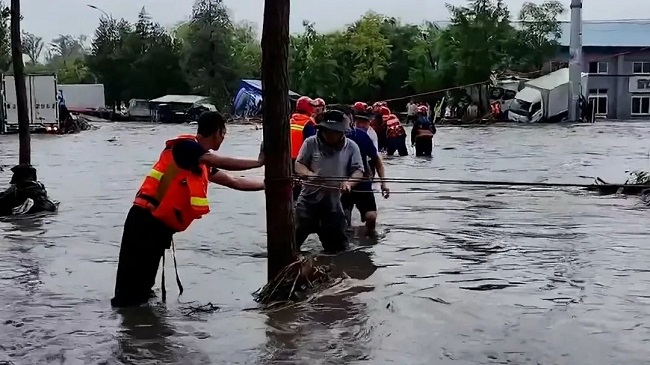 北京持續(xù)強降雨,此時網(wǎng)絡(luò)上出現(xiàn)了一則求助信息,有幾十人在房山區(qū)周口店鎮(zhèn)順心捷達集配站被困?,F(xiàn)場視頻顯示,該集配站附近的路被淹,水流湍急,水流沖走了不少物品。7月31日14時許,119 指揮中心調(diào)派房山區(qū)消防救援支隊和特勤支隊攜帶沖鋒舟等搶險救災(zāi)的工具第一時間趕往現(xiàn)場,到場時現(xiàn)場水位較深,有人員被困在集裝箱上等地勢高的地方。救援迅速展開,風(fēng)雨中,消防員通過繩索建立救生通道,利用舟艇進行人員轉(zhuǎn)移。14時53分,被困的117人全部被救出。
