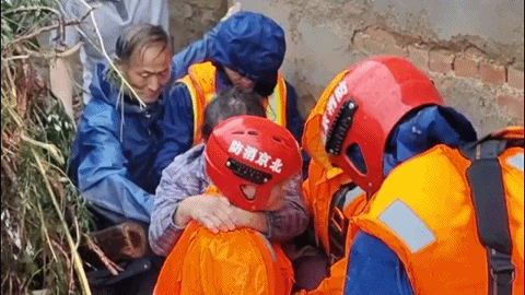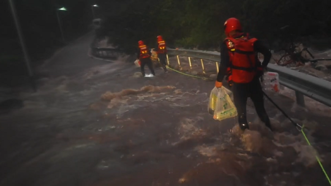 7月31日上午,門頭溝區(qū)潭柘寺消防救援站接到報警,門頭溝區(qū)南辛房村有群眾被困,其中不少是行動不便的老人。消防救援人員到達村口后發(fā)現(xiàn),進村道路已被洪水淹沒,只能利用繩索搭建生命通道。消防救援站指揮員安全評估后,選派3名消防員跨河搭建繩索系統(tǒng),其他人員攜帶救援裝備沿著繩索挺進村里。在與村委會工作人員碰面會和商討救援方案后,消防救援人員將被困群眾一一引導(dǎo)至村口。消防救援人員先給老人穿戴好防護裝備,接著讓老人坐在兩節(jié)拉梯上固定,隨后肩扛拉梯,沿著此前搭建的繩索通道,一步一步穩(wěn)穩(wěn)當當將老人們轉(zhuǎn)移至河對岸安全區(qū)域。8月1日上午,經(jīng)過連續(xù)26個小時晝夜奮戰(zhàn),消防救援人員在南辛房村共營救疏散被困群眾169人。