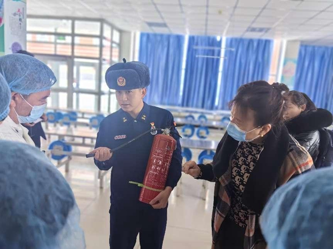 圖為塔城地區(qū)額敏縣消防救援大隊(duì)消防員對學(xué)校食堂職工進(jìn)行消防安全培訓(xùn)