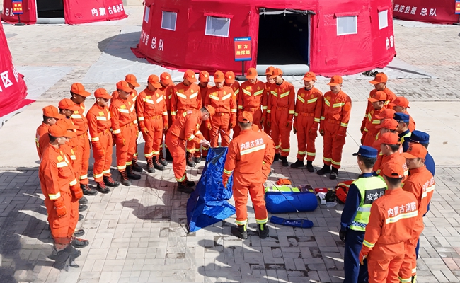 此次演練設(shè)定內(nèi)蒙古自治區(qū)某地發(fā)生地震災(zāi)害,建筑物倒塌損毀、人員被困、道路中斷,根據(jù)災(zāi)情和跨區(qū)域增援實際需要,需要進行大規(guī)模、長時間、全天候的搶險救災(zāi)。訓(xùn)練與戰(zhàn)勤保障支隊接到總隊命令后,依據(jù)災(zāi)情實際特點,立即啟動《重大災(zāi)害事故救援任務(wù)戰(zhàn)勤保障作戰(zhàn)響應(yīng)機制》和《重大災(zāi)害事故救援任務(wù)跨區(qū)域戰(zhàn)勤保障預(yù)案》,調(diào)集支隊?wèi)?zhàn)勤保障分隊和新藍特訓(xùn)隊130名指戰(zhàn)員以及供氣消防車、供液消防車、飲食保障車、移動盥洗車、器材運輸車、裝備搶修車等14輛各類保障車輛、780余件(套)保障器材、1800余件(套)保障物資奔赴現(xiàn)場,1小時內(nèi)到場集結(jié),為一線救援人員提供戰(zhàn)勤保障支援。