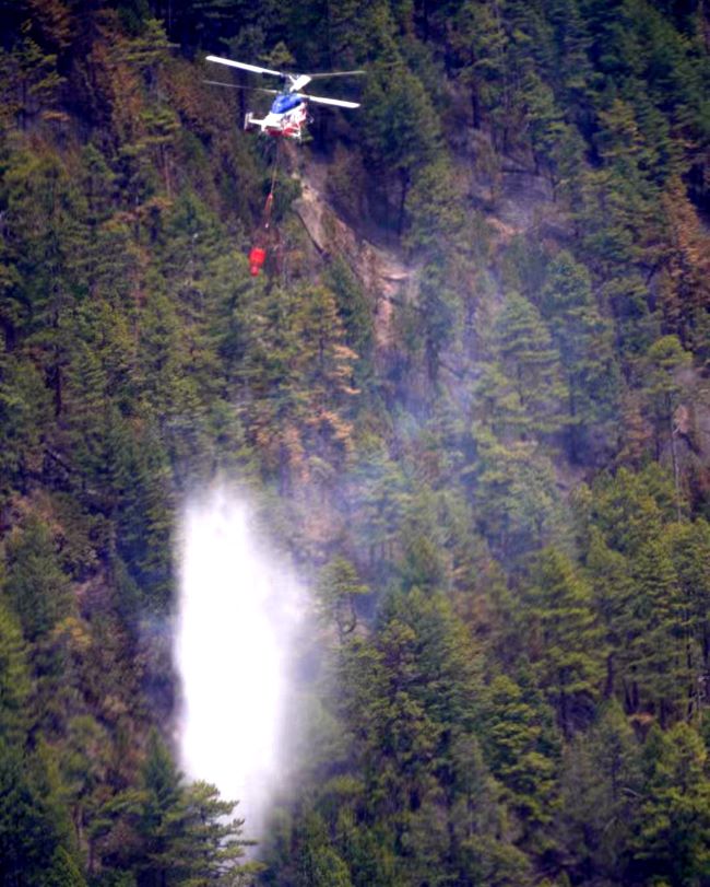 根據(jù)雅江火場1、2、3號火場發(fā)展態(tài)勢,結(jié)合火場、機型特點,航空救援隊伍及時調(diào)整力量編成,分批次梯隊起飛對3個火場實施吊桶灑水。滅火作戰(zhàn)中,地面隊伍及時提供主攻方向火頭火線的精準坐標位置,直升機快速準確實施吊桶灑水,形成撲救合力,極大提高滅火效率。
