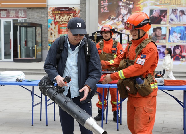 活動現(xiàn)場,消防員們還設立了宣傳展位,向過往游客和當?shù)鼐用癜l(fā)放防火宣傳資料,認真講解森林火災的危害、預防措施以及遇到火災時的應急處置方法。同時,現(xiàn)場還帶來了各種先進的滅火裝備進行展示,吸引了眾多游客的目光。在展示過程中,消防員們邀請游客親身體驗滅火裝備的使用。一名山東籍小伙兒自告奮勇地嘗試了風力滅火機,在消防員的指導下,他很快掌握了使用方法?!霸瓉頊缁鹧b備這么重??!現(xiàn)在才體會到消防員滅火有多累,也真切體會到森林防火每個人都有責任,今后我要把這份責任記在心里,用行動和消防員一起共同守護綠色家園!”小伙兒信心滿滿地說。