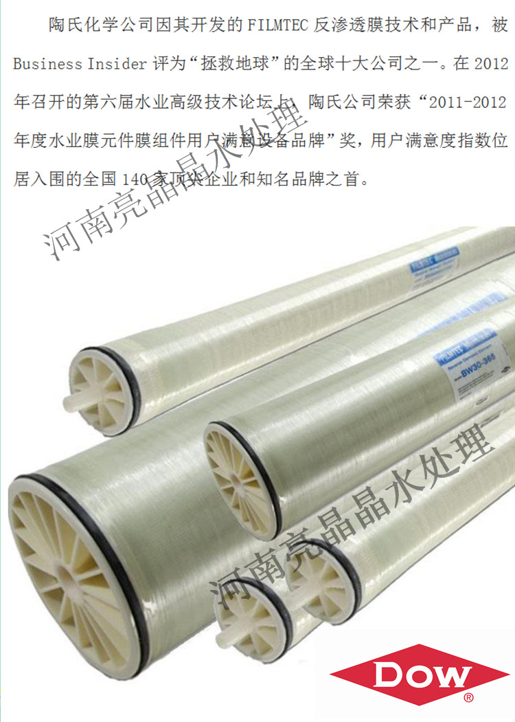 陶氏(FILMTEC)膜元件僅在美國(guó)生產(chǎn),完全原裝進(jìn)口,產(chǎn)品出自技術(shù)領(lǐng)先的自動(dòng)化生產(chǎn)線,膜片絕無(wú)補(bǔ)丁,脫鹽層更厚,可采用無(wú)機(jī)酸堿強(qiáng)烈清洗,全自動(dòng)的元件組裝技術(shù),成品無(wú)需通水檢驗(yàn),真正保證了全球一致的供貨品質(zhì)膜元件廣泛用于電力、石油化工、鋼鐵、電子、醫(yī)藥、食品飲料、市政及環(huán)保等領(lǐng)域,在海水及苦咸水淡化,鍋爐給水、工業(yè)純水及電子級(jí)超純水制備,飲用純凈水生產(chǎn),廢水處理及特種分離過(guò)程中發(fā)揮著重要作用。