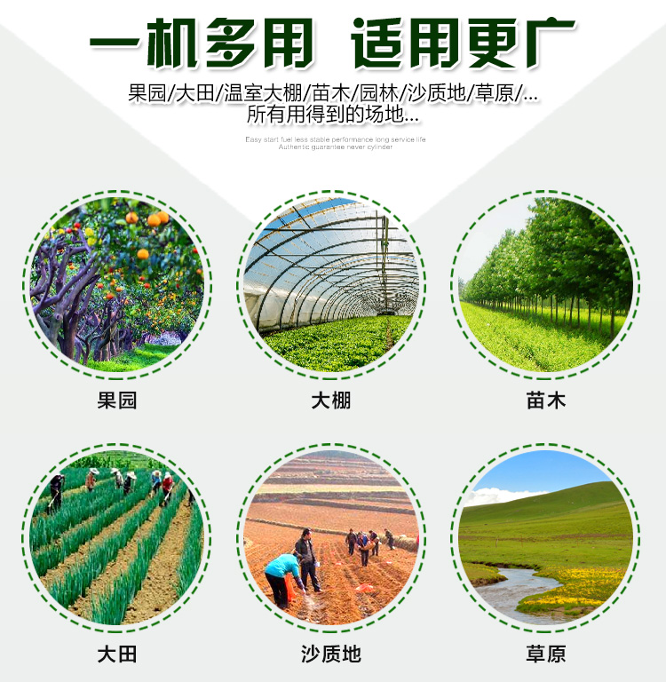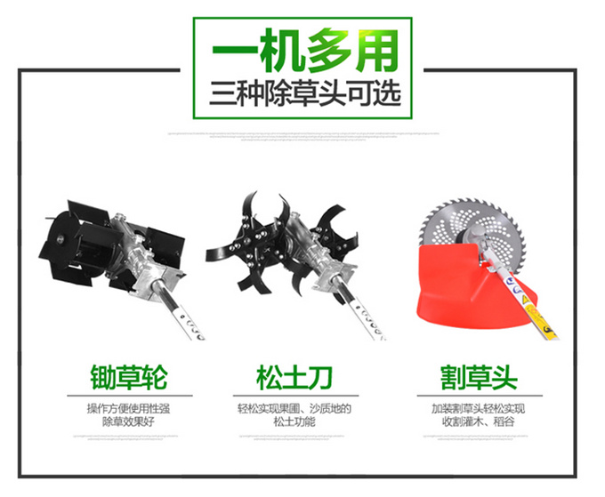 廣泛適用于田間耕作,塑料大棚、煙草、苗圃,果園,茶園的管理,茶葉等鋤草種植作業(yè),具有重量輕,體積小,結(jié)構(gòu)簡單,操作方便,易于維修,油耗低,生產(chǎn)效率高等特點。