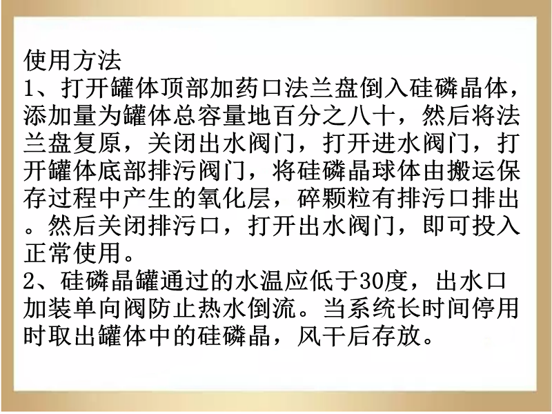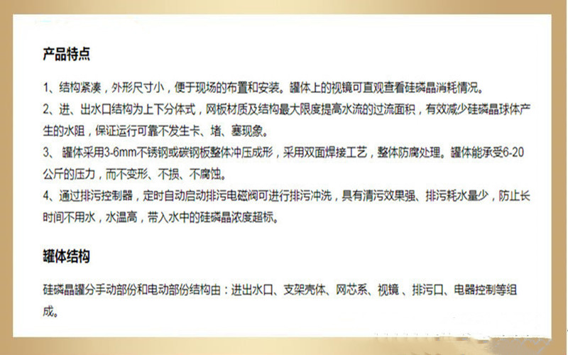 選用硅磷晶罐時(shí),用戶應(yīng)該根據(jù)實(shí)際需要以及硅磷晶的添加量選擇合適的材質(zhì)和型號(hào),目前常用的過(guò)濾器材質(zhì)有不銹鋼和碳鋼兩種。不銹鋼硅磷晶罐承壓能力一般在0.6Mpa(6公斤)。sldgle