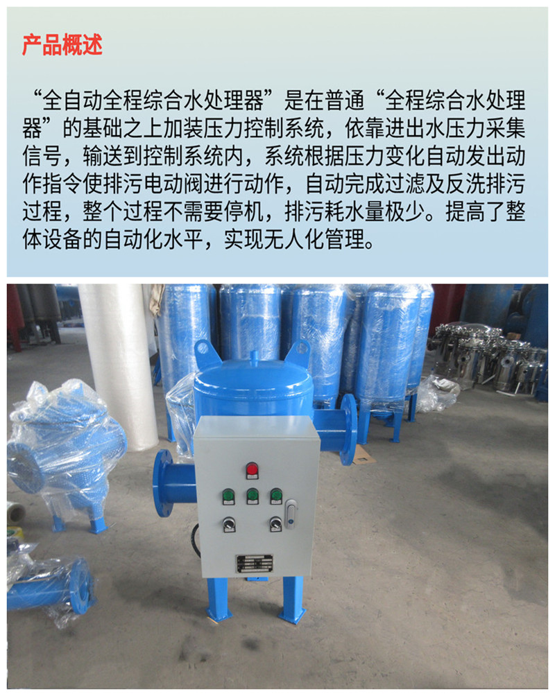 “全自動全程綜合水處理器”是在普通“全程綜合水處理器”的基礎之上加裝壓力控制系統(tǒng),依靠進出水壓力采集信號,輸送到控制系統(tǒng)內,系統(tǒng)根據壓力變化自動發(fā)出動作指令使排污電動閥進行動作,自動完成過濾及反洗排污過程,整個過程不需要停機,排污耗水量極少。提高了整體設備的自動化水平,實現(xiàn)無人化管理。