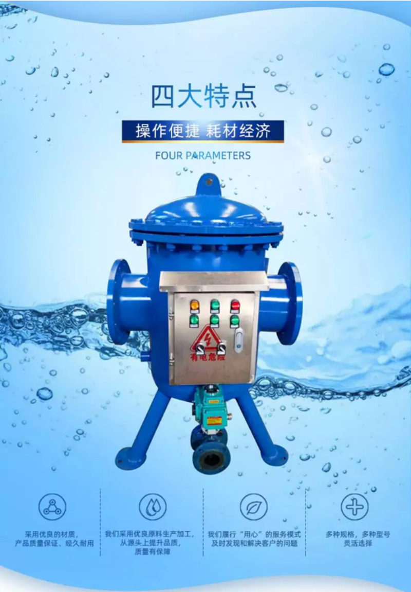 靠壓力傳感器采集壓力信號,送到全自動控制箱內(nèi)的可編程控制器進行比較,然后自動發(fā)出動作指令使電動閥門連續(xù)動作,自動完成過濾及反沖洗排污過程,排污耗水量極少。實時在線檢,智能處理,可通過人機界面修正參數(shù),有通訊接口。sldgle