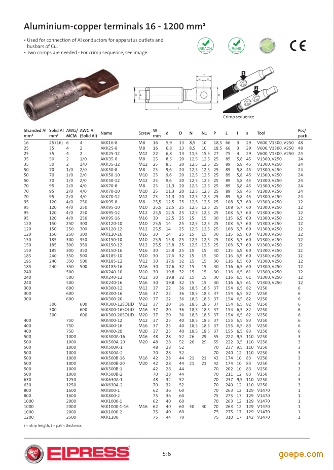 鋁銅連接器,鋁管部分適用于400mm2絞合鋁電纜,銅管部分適用于240mm2絞合/多芯銅電纜。壓接銅管部時,將模具放在銅管上的環(huán)形標記和銅管部邊緣之間。與經過認證的Elpress系統(tǒng)V1300,V250一起使用。