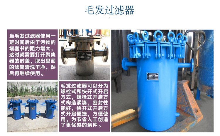 毛發(fā)過(guò)濾器適用于各種水的預(yù)處理,該設(shè)備能去除水中較大的雜物,如:毛發(fā)、紙片、雜草、塑料袋、塑料片等;該設(shè)備的安裝和使用能有效防止水泵和后續(xù)設(shè)備的堵塞,保障整個(gè)系統(tǒng)的正常運(yùn)行。毛發(fā)過(guò)濾器可以加工碳鋼,不銹鋼和塑料材質(zhì)。絲桿也叫做快開(kāi)、法蘭和卡箍等多種開(kāi)啟方式,法蘭開(kāi)啟方式利用螺栓擰緊,密封性能好,快開(kāi)式利用絲桿轉(zhuǎn)動(dòng)開(kāi)啟便捷,方便使用,兩種開(kāi)啟方式可供客戶(hù)選擇定制。