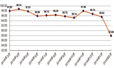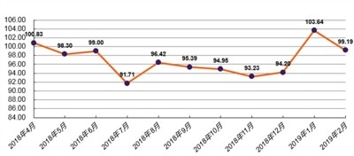 2019年2月永康五金產(chǎn)品生產(chǎn)景氣總指數(shù)趨勢圖