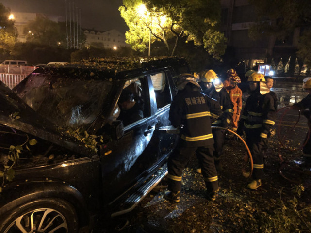 更危險的是,車頭蓋內(nèi)有煙冒出,斷裂的大樹枝干凌亂地壓在上面。撞倒的路燈,電線裸露在外,因為下雨時不時冒出火花,現(xiàn)場情況十分危急。