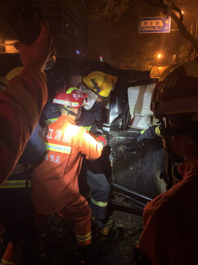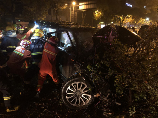 3月21日凌晨3時40分左右,義烏市城中中路138號附近發(fā)生一起嚴重車禍,一輛路虎車接連撞毀路燈和粗壯的綠化樹,導致車內(nèi)兩名人員被困。義烏消防接警后,立即調派稠江中隊、稠城專職隊2車13人趕赴現(xiàn)場營救。瓢潑大雨中,消防隊員經(jīng)過近40分鐘的努力,成功營救被困人員。