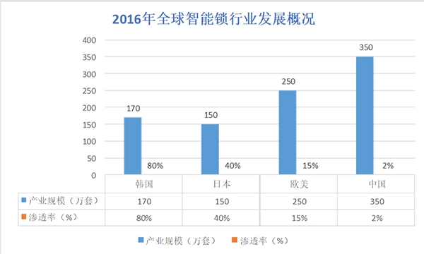 2018年11月28日,全國鎖具信息中心調(diào)查數(shù)據(jù)顯示,2017年全球市場智能鎖產(chǎn)業(yè)規(guī)模達到1600萬套。其中日本達到200萬套,韓國達到200萬套,歐美市場達到300萬套,中國達到600萬套,其它等市場約300萬套,預(yù)計到2020年全球智能鎖產(chǎn)業(yè)規(guī)模將達到5100萬套。