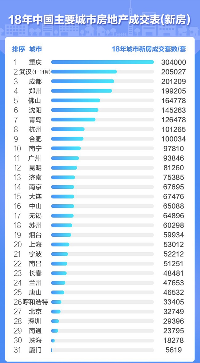 ?。▓D二:2018年中國主要城市房地產(chǎn)新房成交表)