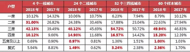 從上方圖表中可以得知:2018年房地產(chǎn)市場,賣得最好的住宅是三房,其次是兩房,四房成交也保持了一定的增幅,其中二、三線城市同比增幅最大。