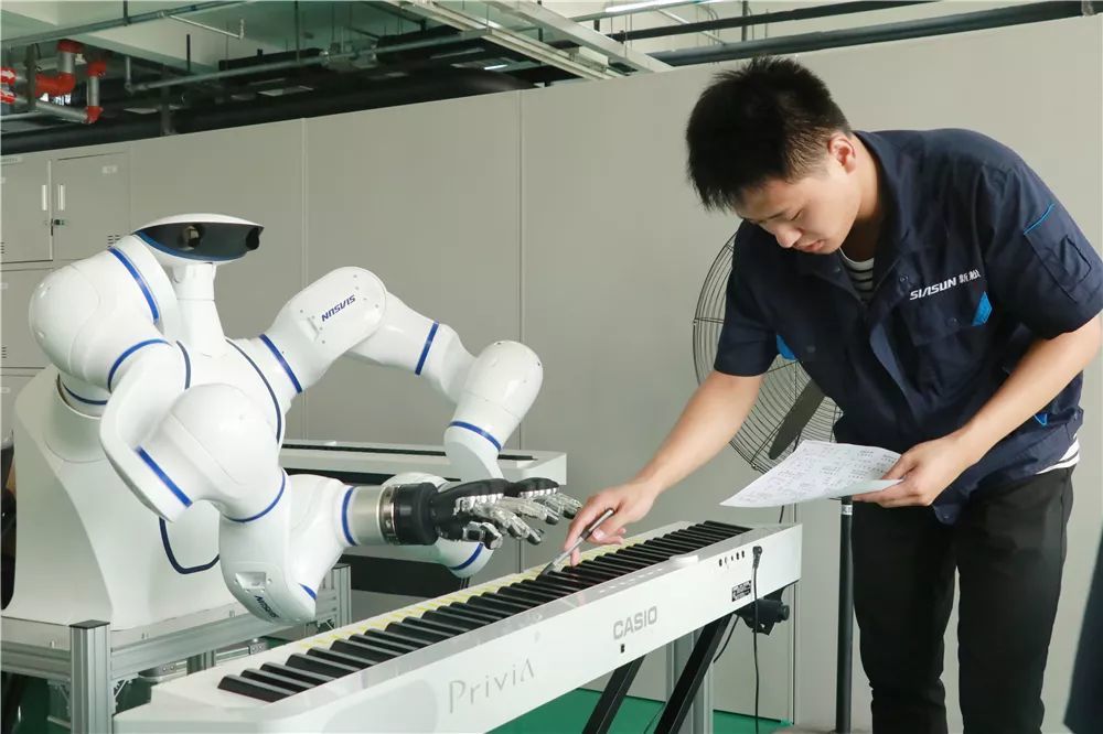 新松雙臂協(xié)作機(jī)器人與兩名小演奏家聯(lián)手彈奏經(jīng)典曲目《我和我的祖國》,旋律悠揚(yáng),令人動(dòng)容。現(xiàn)代藝術(shù)與人工智能在這一刻充分融合,展示了改變未來的科技曙光。