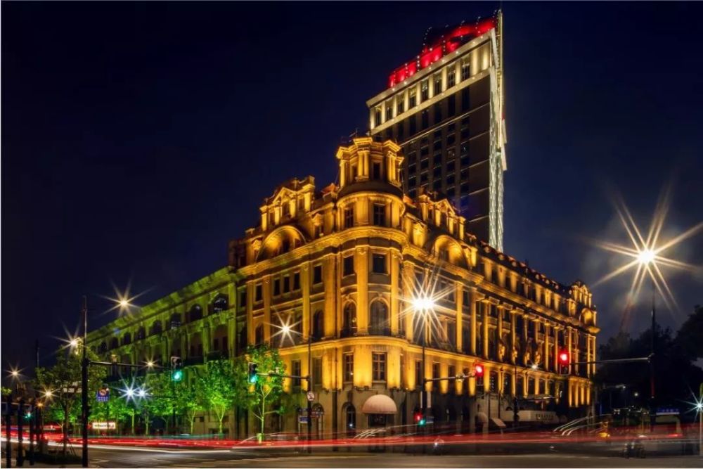上海展覽中心的夜間景觀燈光也是靜安區(qū)一大亮點,該建筑景觀燈光系統(tǒng)建于2001年。