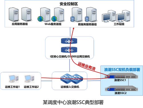 浪潮ssc交付團(tuán)隊(duì)為客戶設(shè)計(jì)的部署方案如圖所示,在省/地市調(diào)度中心安全控制區(qū)運(yùn)維接入交換機(jī)上旁路接入兩臺(tái)浪潮ssc設(shè)備,采用雙機(jī)負(fù)載運(yùn)行模式,保證運(yùn)維業(yè)務(wù)高可用性。同時(shí),為保證運(yùn)維工作統(tǒng)一入口、事前認(rèn)證、事中安全監(jiān)控和事后行為審計(jì),所有運(yùn)維工作流均需經(jīng)過(guò)浪潮ssc才能進(jìn)入安全控制區(qū)的服務(wù)器、工作站。