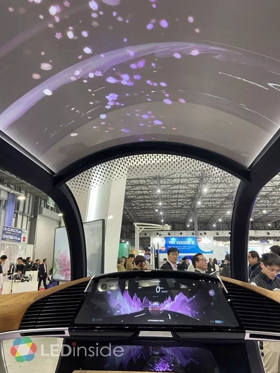 模擬無(wú)人自駕車的體驗(yàn),讓車子頂部化為透明顯示器,配合天氣及外在環(huán)境,將乘車體驗(yàn)與環(huán)境結(jié)合,呈現(xiàn)出未來(lái)的車用顯示可能的應(yīng)用方向。