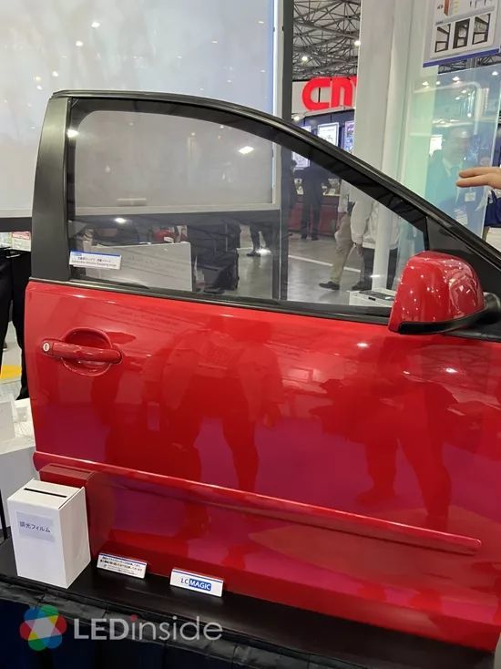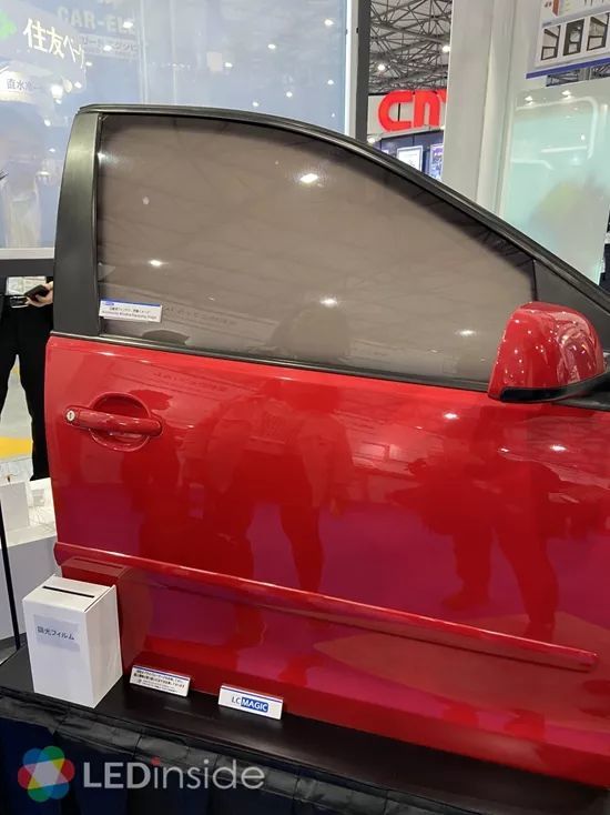 toppan也展出可改變透明度的車用貼膜,貼在透明玻璃上藉由控制電流能夠調(diào)整玻璃的透明度,同時(shí)增強(qiáng)安全性以及隱私性。