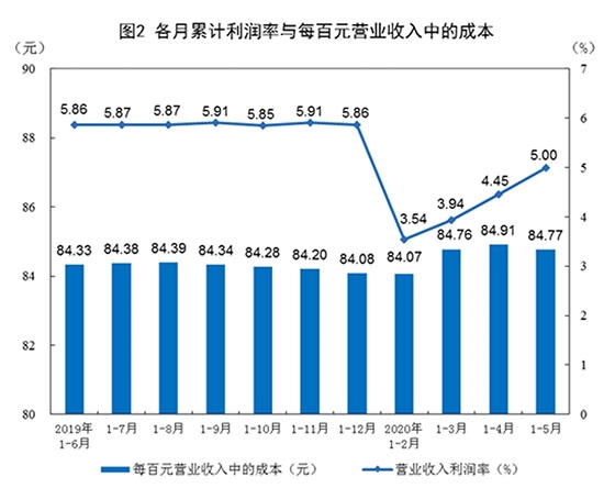 1-5月份,規(guī)模以上工業(yè)企業(yè)實(shí)現(xiàn)營業(yè)收入36.88萬億元,同比下降7.4%;發(fā)生營業(yè)成本31.26萬億元,下降6.8%;營業(yè)收入利潤率為5.00%,同比降低0.74個(gè)百分點(diǎn)。
