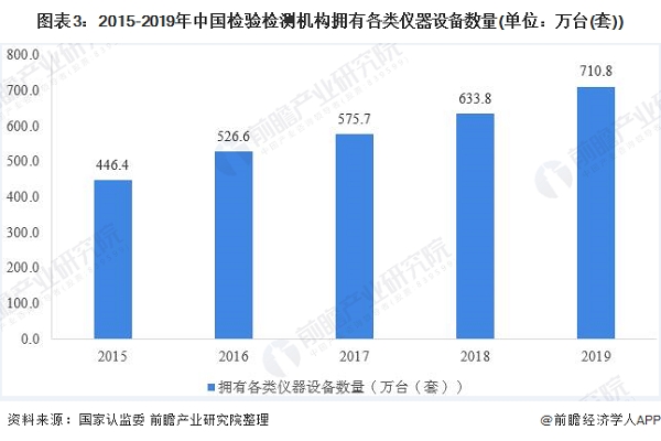 據(jù)認監(jiān)委數(shù)據(jù)統(tǒng)計分析顯示,2015年至今,中國第三方檢測機構(gòu)持有各種類型檢測儀器設(shè)備總數(shù)經(jīng)營規(guī)模增長快速,截至到2019年底,中國第三方檢測機構(gòu)共持有各種類型檢測儀器設(shè)備710.82萬臺套,同比增加12.16%。