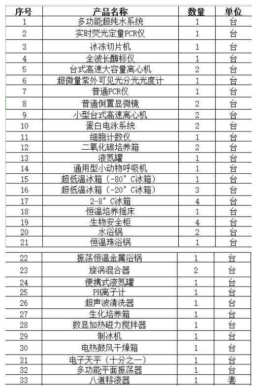根據(jù)招標(biāo)文件,此次招標(biāo)所需購(gòu)置儀器設(shè)備較多,具體包括多功能超純水系統(tǒng)、實(shí)時(shí)熒光定量PCR儀、冰凍切片機(jī)、全波長(zhǎng)酶標(biāo)儀、臺(tái)式高速大容量離心機(jī)、超微量紫外可見光分光光度計(jì)、普通PCR儀、普通倒置顯微鏡、小型臺(tái)式高速離心機(jī)、蛋白電泳系統(tǒng)、細(xì)胞計(jì)數(shù)儀、二氧化碳培養(yǎng)箱、液氮罐、通用型小動(dòng)物呼吸機(jī)、超低溫冰箱(-80°C冰箱)、超低溫冰箱(-20°C冰箱)、2-8°C冰箱、恒溫培養(yǎng)搖床、生物安全柜、水浴鍋、恒溫珠浴鍋、振蕩恒溫金屬浴鍋、旋渦混合器、便攜式液氮罐、PH離子計(jì)、超聲波清洗器、生化培養(yǎng)箱、數(shù)顯加熱磁力攪拌器、制冰機(jī)、電熱鼓風(fēng)干燥箱、電子天平(十分之一)、多功能平面振蕩器等。
