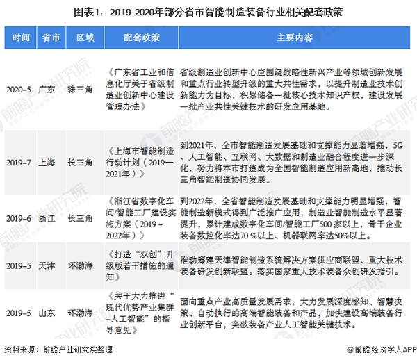 智能制造裝備的水平已成為當(dāng)今衡量一個(gè)國(guó)家工業(yè)化水平的重要標(biāo)志。制造業(yè)是我國(guó)的支柱產(chǎn)業(yè),但與發(fā)達(dá)國(guó)家的技術(shù)差異使我國(guó)只能從事勞動(dòng)密集型產(chǎn)業(yè),效率低、利潤(rùn)少。智能制造裝備是制造業(yè)轉(zhuǎn)型升級(jí)的關(guān)鍵。因?yàn)橹悄苤圃煅b備系統(tǒng)的主要特征體現(xiàn)了制造業(yè)生產(chǎn)的智能化,意味著從本質(zhì)上提高生產(chǎn)效率,我國(guó)也將大力發(fā)展。近幾年,智能制造裝備產(chǎn)業(yè)受到國(guó)家的高度重視,各省市出臺(tái)了一系列鼓勵(lì)政策,政策支持下智能制造裝備快速發(fā)展。2018年11月,國(guó)家統(tǒng)計(jì)局發(fā)布了《戰(zhàn)略性新興產(chǎn)業(yè)分類(2018)》,智能制造裝備產(chǎn)業(yè)被納入戰(zhàn)略性新興產(chǎn)業(yè)。2020年5月,《廣東省工業(yè)和信息化廳關(guān)于省級(jí)制造業(yè)創(chuàng)新中心建設(shè)管理辦法》指出省級(jí)制造業(yè)創(chuàng)新中心應(yīng)圍繞戰(zhàn)略性新興產(chǎn)業(yè)等領(lǐng)域創(chuàng)新發(fā)展和重點(diǎn)行業(yè)轉(zhuǎn)型升級(jí)的重大共性需求,積累儲(chǔ)備一批核心技術(shù)知識(shí)產(chǎn)權(quán),建設(shè)發(fā)展一批產(chǎn)業(yè)共性關(guān)鍵技術(shù)的研發(fā)應(yīng)用基地。