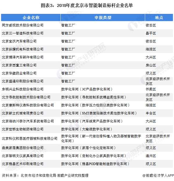 2020年6月,北京市經(jīng)濟(jì)和信息化局組織開(kāi)展了2019年度北京市智能制造標(biāo)桿企業(yè)遴選工作。2019年度北京市智能制造標(biāo)桿企業(yè)包括同方威視技術(shù)股份有限公司、北京三一智造科技有限公司、北京寶沃汽車有限公司等,類型包括智能工廠、數(shù)字化車間等。