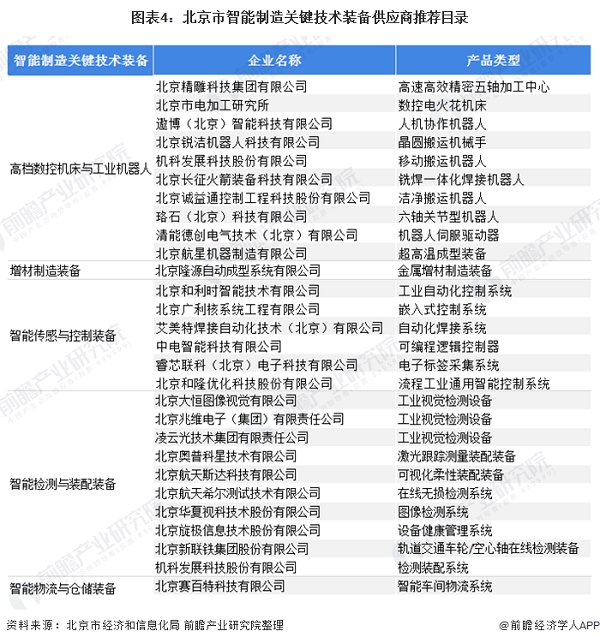 2019年5月,北京市經(jīng)濟(jì)和信息化局發(fā)布了北京市智能制造關(guān)鍵技術(shù)裝備供應(yīng)商推薦目錄,智能制造關(guān)鍵技術(shù)裝備中高檔數(shù)控機(jī)床與工業(yè)機(jī)器人、增材制造裝備、智能傳感與控制裝備、智能檢測(cè)與裝配裝備、智能物流與倉(cāng)儲(chǔ)裝備有28家供應(yīng)商,產(chǎn)品類型包括高速高效精密五軸加工中心、數(shù)控電火花機(jī)床、人機(jī)協(xié)作機(jī)器人等。