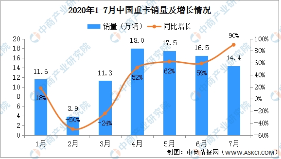 具體來看,今年1月,我國重卡銷量11.6%萬輛創(chuàng)下新高,同比增長18.2%;2月、3月受疫情影響,重卡銷量連續(xù)下跌;4月市場呈現(xiàn)恢復(fù)性反彈,銷量增長超五成;5月,重卡延續(xù)增長勢頭,銷量將近18萬輛,漲幅達到62%;6月,重卡市場保持產(chǎn)銷兩萬的勢頭,銷量達到16.5萬輛,同比漲幅將近六成;7月銷量約為14.4萬輛,同比增長九成,主要得益于二季度重卡行業(yè)訂單回暖、國三柴油車提前淘汰、各地治超政策趨嚴等因素影響。此外,今年基建工程項目開工較往年后移,部分工程車需求也推遲釋放。