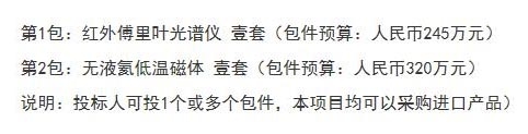 根據(jù)公告顯示,華東師范大學(xué)要采購(gòu)的儀器為一套紅外傅里葉光譜儀和一套無(wú)液氦低溫磁體。其中,紅外傅里葉光譜儀預(yù)算245萬(wàn)元,無(wú)液氦低溫磁體預(yù)算320萬(wàn)元。該項(xiàng)目允許進(jìn)口產(chǎn)品投標(biāo),不允許聯(lián)合體投標(biāo),投標(biāo)人可投一個(gè)或多個(gè)包件。