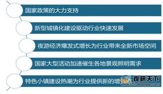 得益于國家各方面政策的推廣支持,中國已經(jīng)成為全球大的景觀亮化市場。未來在新型城鎮(zhèn)化、特色小鎮(zhèn)建設(shè)、智慧城市、智能照明、5G科技等多因素的驅(qū)動下,我國景觀照明市場需求將持續(xù)快速增長,促進行業(yè)的發(fā)展。