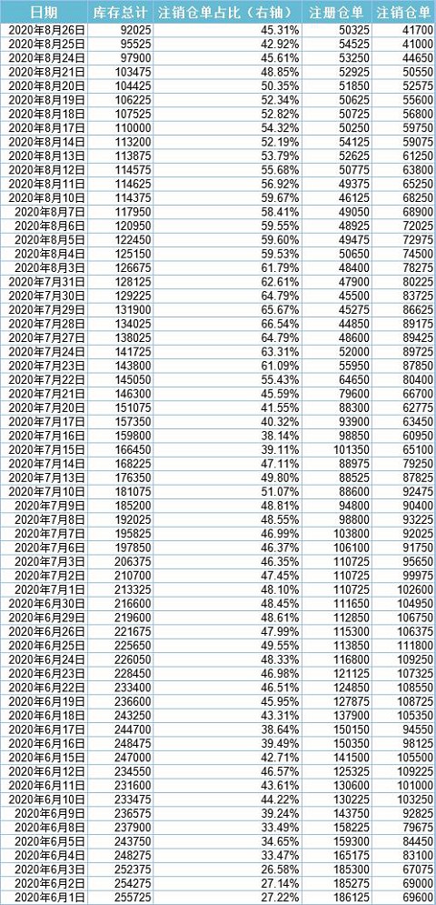 LME公布的數(shù)據(jù)顯示,截至8月26日,LME銅注銷倉單終結六連降,小幅回升至41700噸,注銷占比略有反彈至45.31%。注冊倉單昨日下降逾4000噸至50325噸。