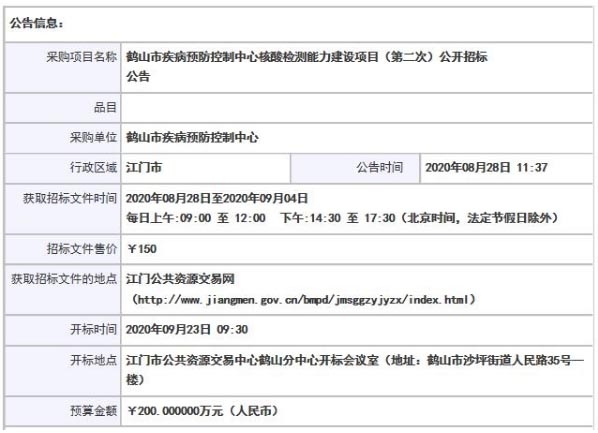為了更好地應(yīng)對國內(nèi)外傳染病疫情,開展重點(diǎn)傳染病防控,鶴山市疾病預(yù)防控制中心計劃采購一批新型儀器設(shè)備,并于8月28日委托廣東采聯(lián)采購科技有限公司根據(jù)相關(guān)法律規(guī)范,對項目編號為440784-202008-156004-0001