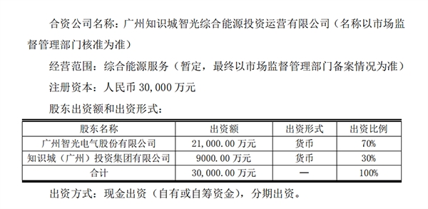 廣州智光電氣擬出資2.1 億與知識(shí)城(廣州)投資集團(tuán)合資成立綜合能源服務(wù)公司