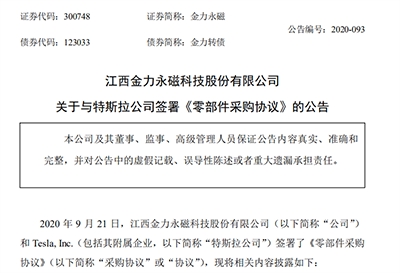 江西金力永磁科技與特斯拉簽署了零部件采購(gòu)協(xié)議