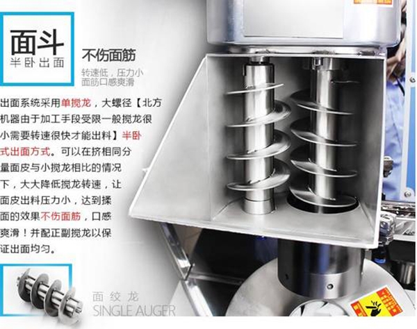 出面系統(tǒng)采用單攪龍,大螺徑半臥式出面,可以在擠相同分量面皮與小攪龍相比的情況下,大大降低攪龍轉(zhuǎn)速,讓面皮出料壓力小,達(dá)到揉面的效果不上面筋,口感爽滑,并配正副攪龍以保證出面均勻。
