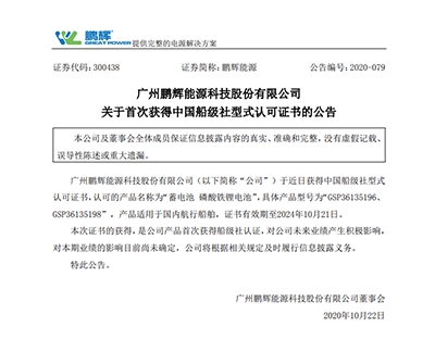 廣州鵬輝蓄電池 磷酸鐵鋰電池獲得中國船級社型式認(rèn)可證書