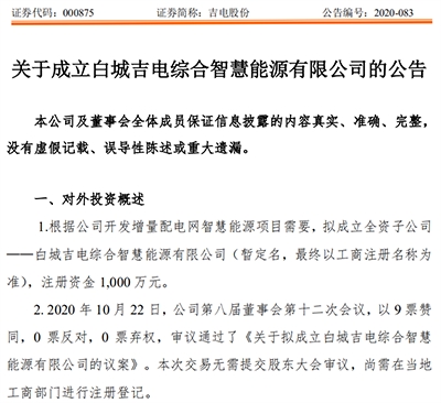 吉林電力股份有限公司擬成立全資子公司——白城吉電綜合智慧能源有限公司