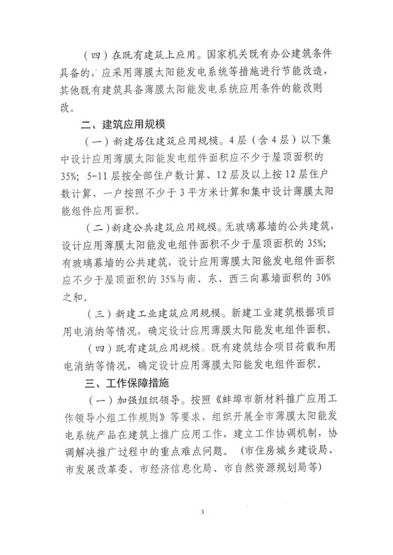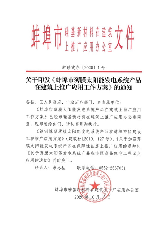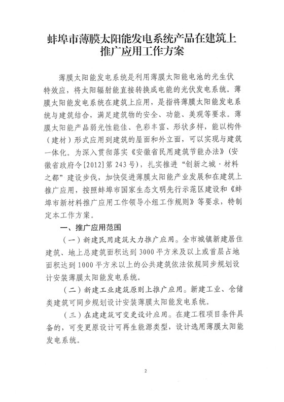安徽蚌埠印發(fā)《蚌埠市薄膜太陽能發(fā)電系統(tǒng)產(chǎn)品在建筑上推廣應(yīng)用工作方案》