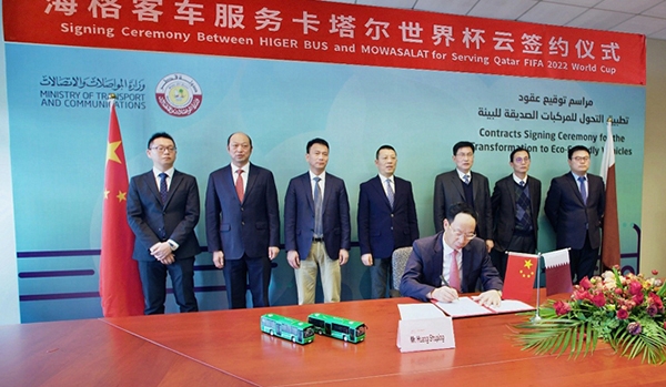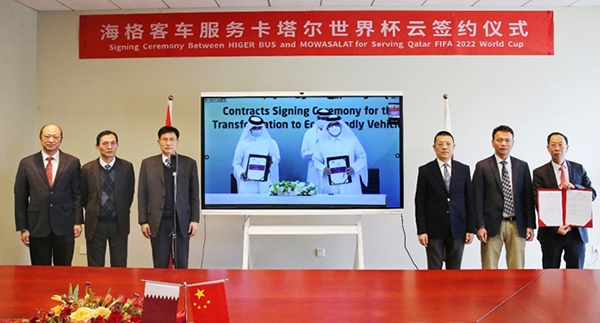 2020年11月30日,中國客車制造再次領(lǐng)舞世界,蘇州金龍海格客車服務(wù)卡塔爾世界杯云簽約儀式在卡塔爾首都多哈和中國蘇州同步舉行,海格客車1815臺(tái)大單成就中國大中型客車出口卡塔爾史上最大批量訂單,這也是2020年中國大中型客車出口的最大批量訂單。在國際疫情形勢嚴(yán)峻,國內(nèi)經(jīng)濟(jì)穩(wěn)步恢復(fù)的當(dāng)下,海格客車以漂亮的成績單,為國家“一帶一路”倡議再譜華章??ㄋ枃羞\(yùn)輸公司CEO法赫德與海格客車總經(jīng)理黃書平鄭重簽署協(xié)議,卡塔爾首相哈立德•阿勒薩尼,卡塔爾交通部部長賈西姆,中國駐卡塔爾大使周劍,使館經(jīng)商處參贊楊松,蘇州工業(yè)園區(qū)管委會(huì)副主任陳東安,創(chuàng)元集團(tuán)董事長劉春奇,蘇州金龍董事長陳篤廉、副總經(jīng)理邱遠(yuǎn)紅、海外銷售公司總經(jīng)理姜海峰等領(lǐng)導(dǎo)共同見證了這一重要時(shí)刻。
