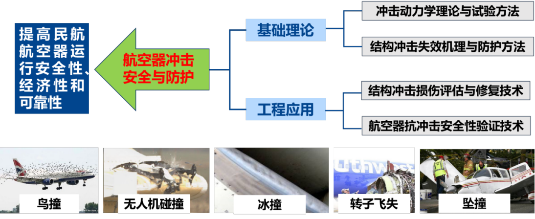 實(shí)驗(yàn)室以提高民航航空器運(yùn)行的安全性、經(jīng)濟(jì)性和可靠性為目標(biāo),從基礎(chǔ)理論和工程應(yīng)用兩個(gè)層面出發(fā),設(shè)立了沖擊動(dòng)力學(xué)理論與試驗(yàn)方法、結(jié)構(gòu)沖擊失效機(jī)理與防護(hù)方法、結(jié)構(gòu)沖擊損傷評(píng)估與修復(fù)技術(shù)、航空器抗沖擊安全性驗(yàn)證技術(shù)四個(gè)研究方向。