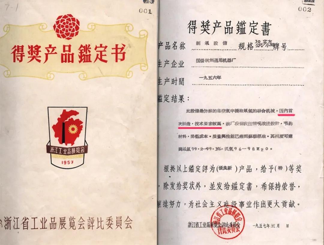 1956年1月,杭氧研制成功了30m3/h成套制氧機(jī),填補(bǔ)了國(guó)內(nèi)制氧機(jī)生產(chǎn)的空白。此產(chǎn)品在1957年的浙江省工業(yè)品博覽會(huì)上被評(píng)為特等獎(jiǎng)。杭氧從此開(kāi)始專業(yè)化批量生產(chǎn)制氧機(jī)。中國(guó)的制氧機(jī)工業(yè)也由此開(kāi)始建立。